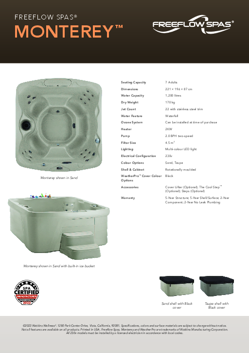 The Monterey spa is one of the largest spas in the Freeflow line, comfortably seating seven adults. Unique to this spa is a built-in ice bucket that holds your beverages of choice. The Monterey is easy to set up, no electrical hardwiring is required, and it’s made from tough, weather-resistant materials with a kiss of sophistication with the wood siding. It features 22 hydrotherapy jets with stainless steel trim and full foam insulation to keep the electric bill low. Sit back, relax, and enjoy this spa by yourself or with friends and family.